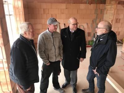 Baustellenbesichtigung beim neuen Sportheim (vlnr.): Vorsitzender Erik Bischoff, Klaus-Dieter Behlen, Bgm. Stephan Paule, Richard Weicker, Ausschussvorsitzender für Soziales, Kultur und Sport Gerd Hebel.Mittleiweile seien sowohl die mittlere Geschossdecke aus Beton fertig, als auch das Mauerwerk im Obergeschoss mit der Unterkonstruktion für das Pultdach hochgezogen worden. Bereits 600 Stunden an Eigenleistung, und damit bereits ein Drittel der einkalkulierten Eigenleistungen, habe der Verein in den vergangenen Monaten erbracht berichtete Vorsitzender Bischoff den Gästen. Rund 70% der Maurerarbeiten seien in Eigenleistung erbracht worden, z. T. gemeinsam mit der beauftragten Baufirma Eurich. Insgesamt rund 20 Vereinsmitglieder hätten gemeinsam mit angepackt, um die Baukosten für den Verein so niedrig wie möglich zu halten. Geplant wurde der Bau vom Büro Weppler-Jungermann, Alsfeld.